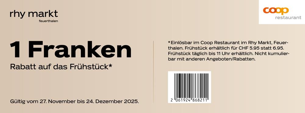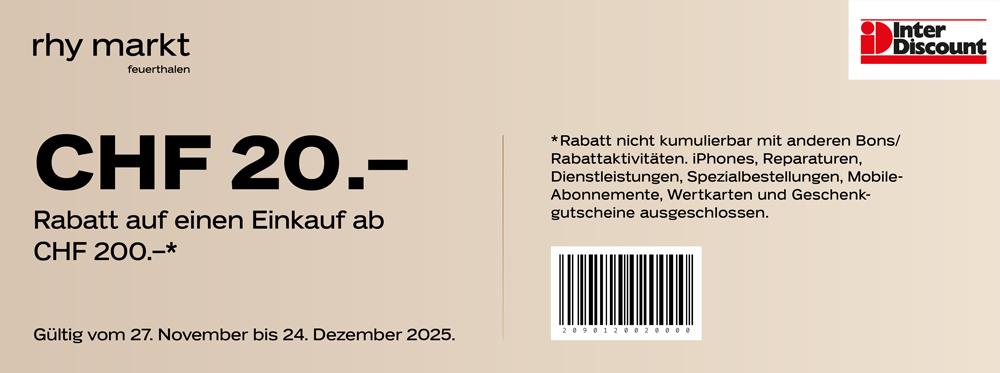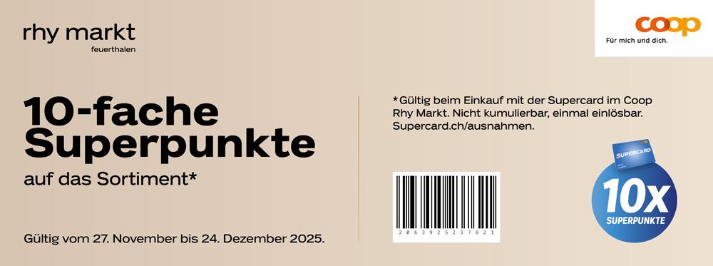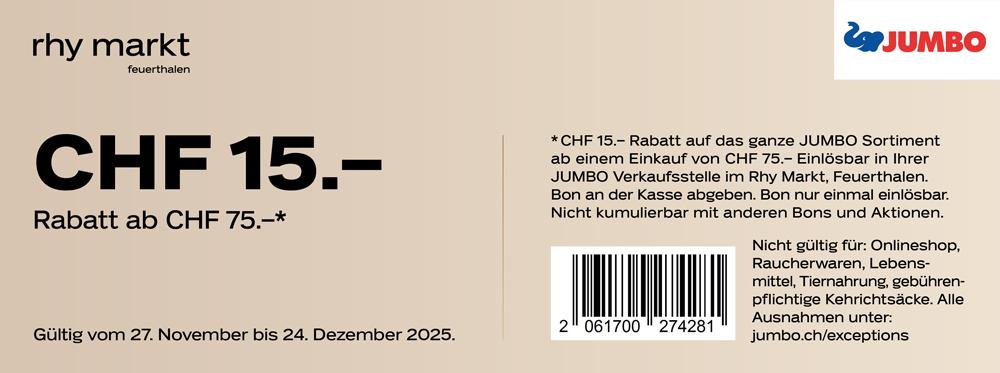 | Geschenkt: Coop-Geschenkkarte im Wert von CHF 20.- ab einem Einkauf von CHF 100.- bei Jumbo und Coop Megastore im Einkaufszentrum Rhy Markt Feuerthalen. | 11.00 | bis | 17.00 |